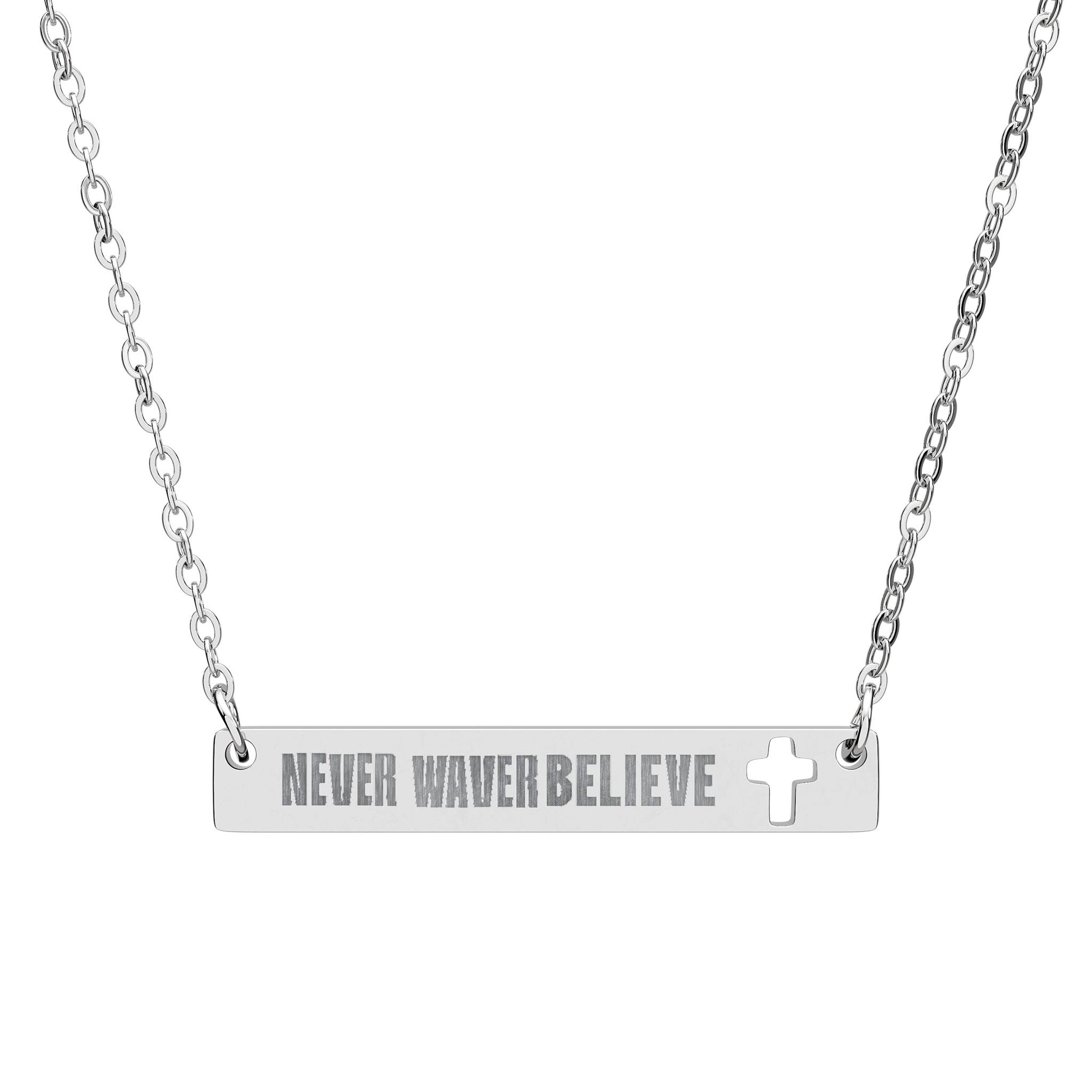 Cutout Cross Bar Necklace — "Never Waver, Believe" Engraved Christian Pendant